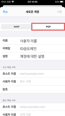 - IMAP을 지원하지 않는 메일일 경우 "POP"을 선택하고, 각각 입력을 한 후 "저장"을 탭합니다.